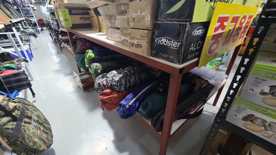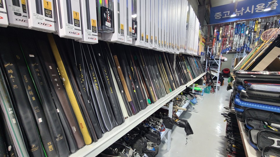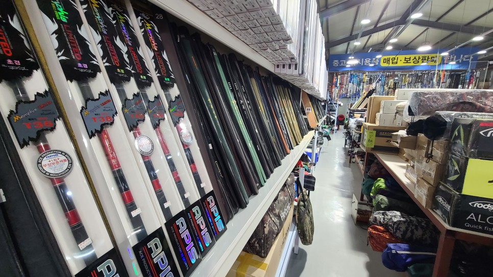 텐트 등 여러가지의 중고 품목들이 잘 진열된 낚시세계