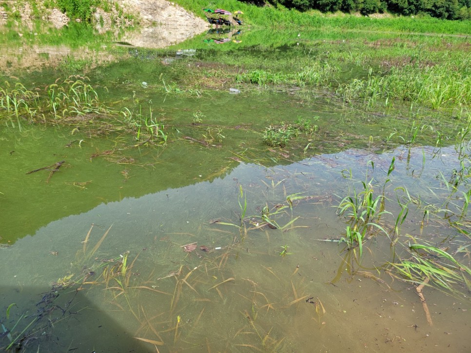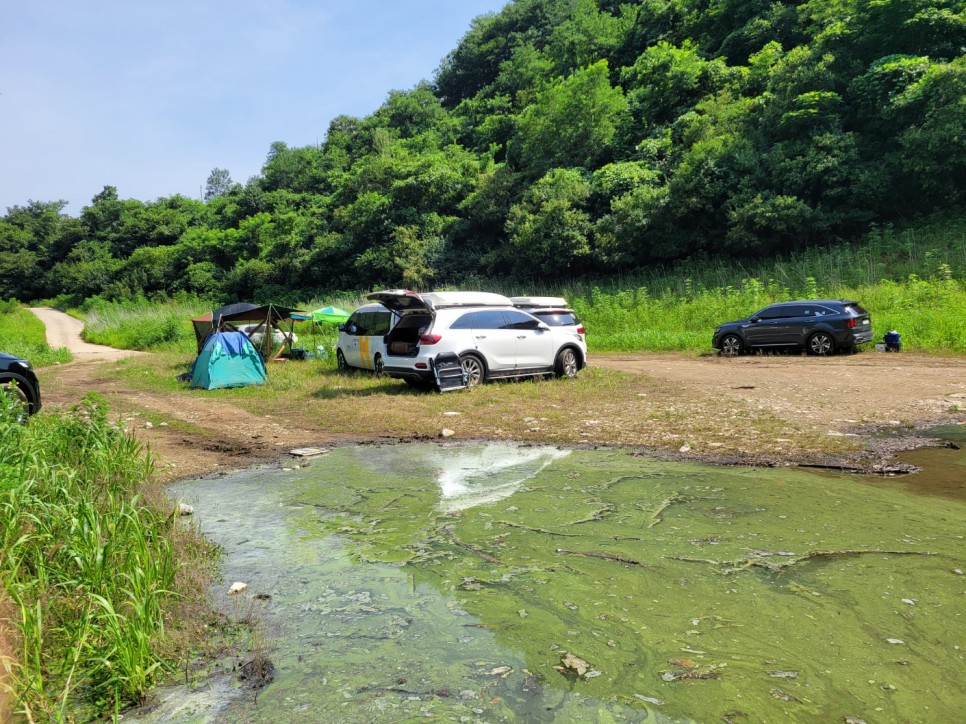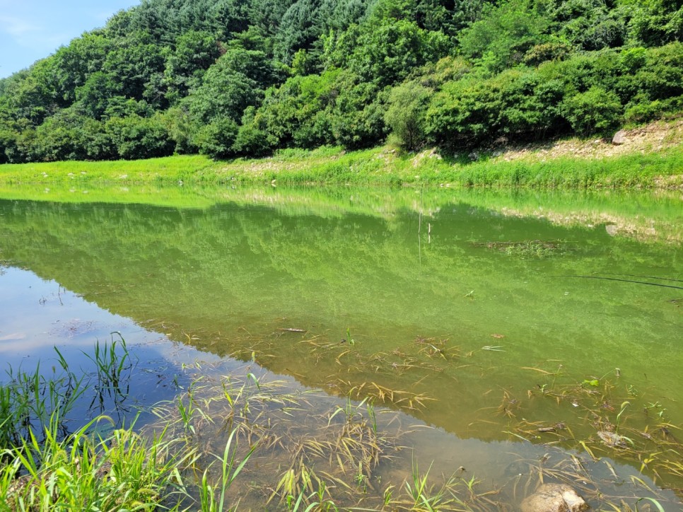 비 그치고 날이 갑자기 뜨거워 녹조도 연안쪽으로부터 생기기 시작하나 봅니다