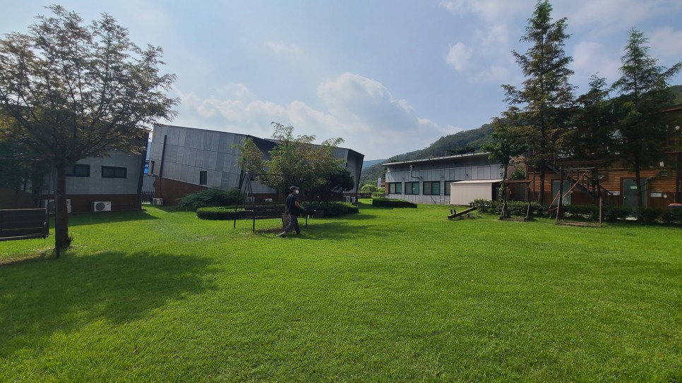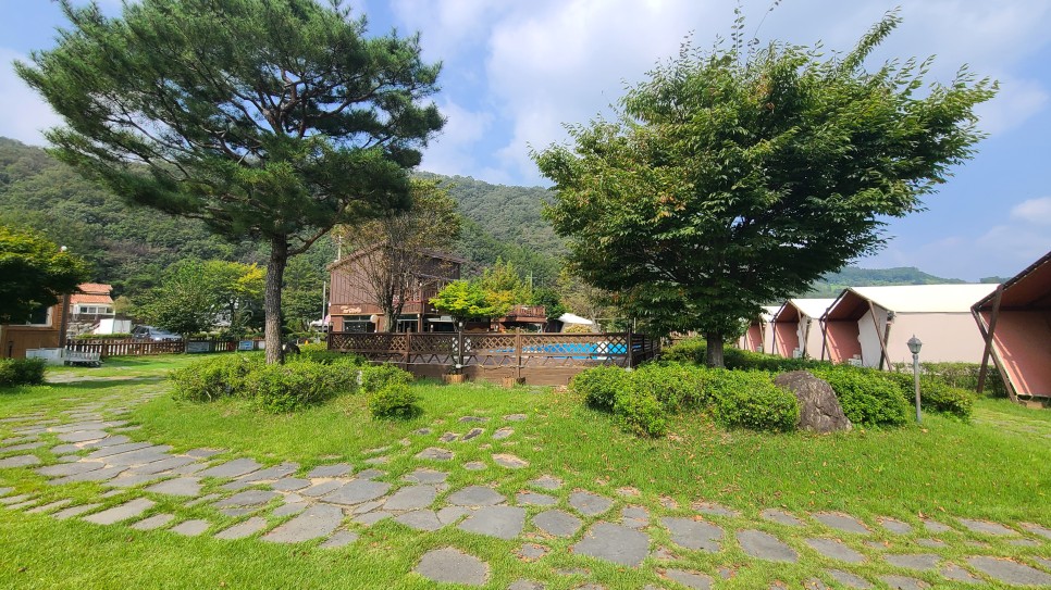 잔디로 곱게 다듬어 편이 쉴 수 있는 홍천 글램핑장