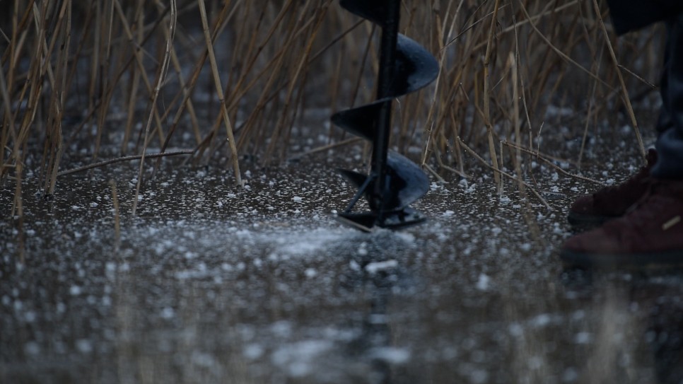 나도 갈대에 찜하고 얼음 구멍을 뚫고 낚시대를 드리우니 수심이 ㅠㅠ